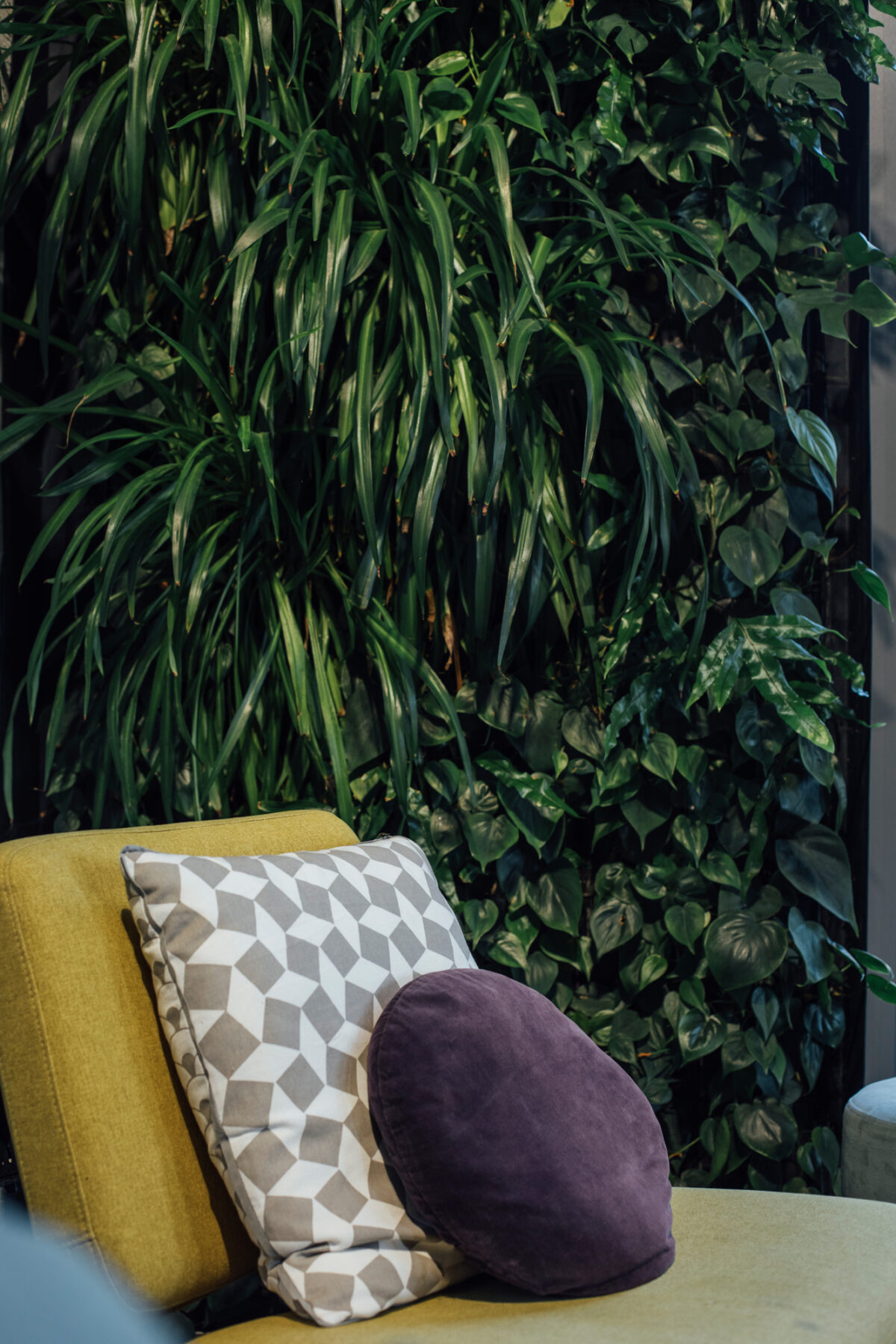 Ein vertikaler Garten von Creaplant bildet das optische Herzstück der gesamten gastronomischen Einrichtung. Durch raumhohe grosszügige Fensteröffnungen wird die Sicht frei auf die Aare und die umliegende Natur. Die Vertikalbegrünung wird durch eine energieeffiziente LED-Beleuchtung perfekt inszeniert. Eine automatische Bewässerungsanlage vorsorgt die Pflanzen bedarfsgerecht mit Wasser und Nährstoffen.