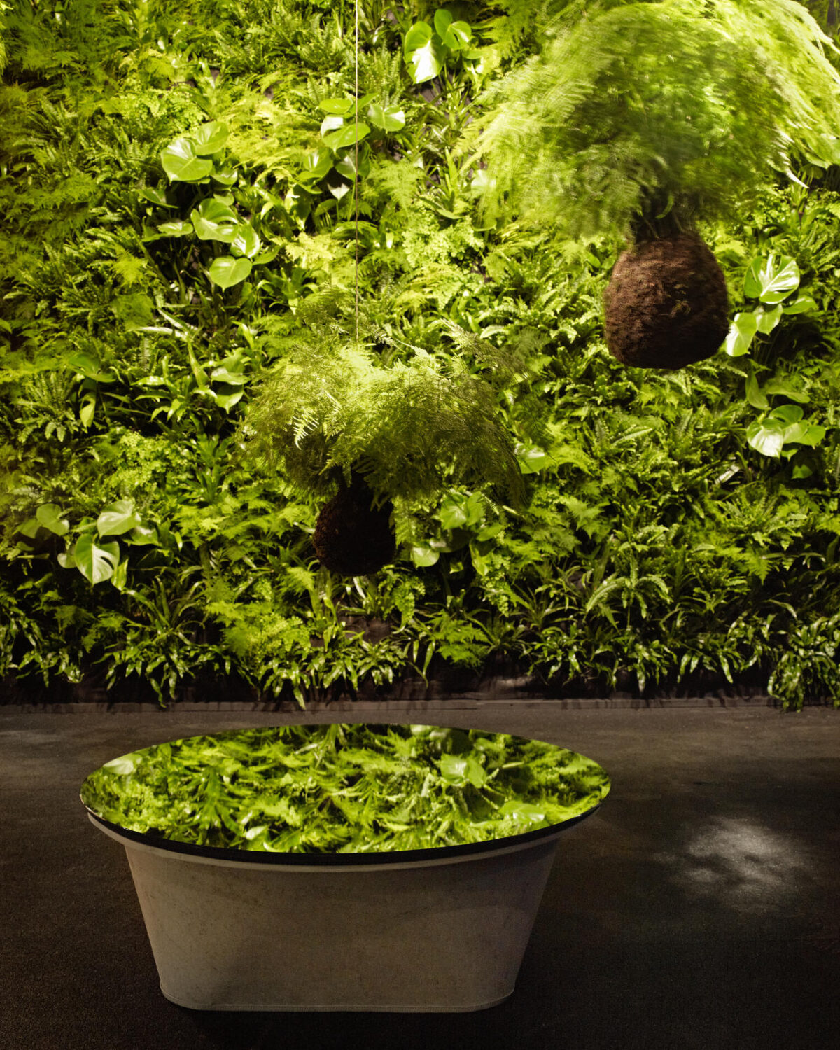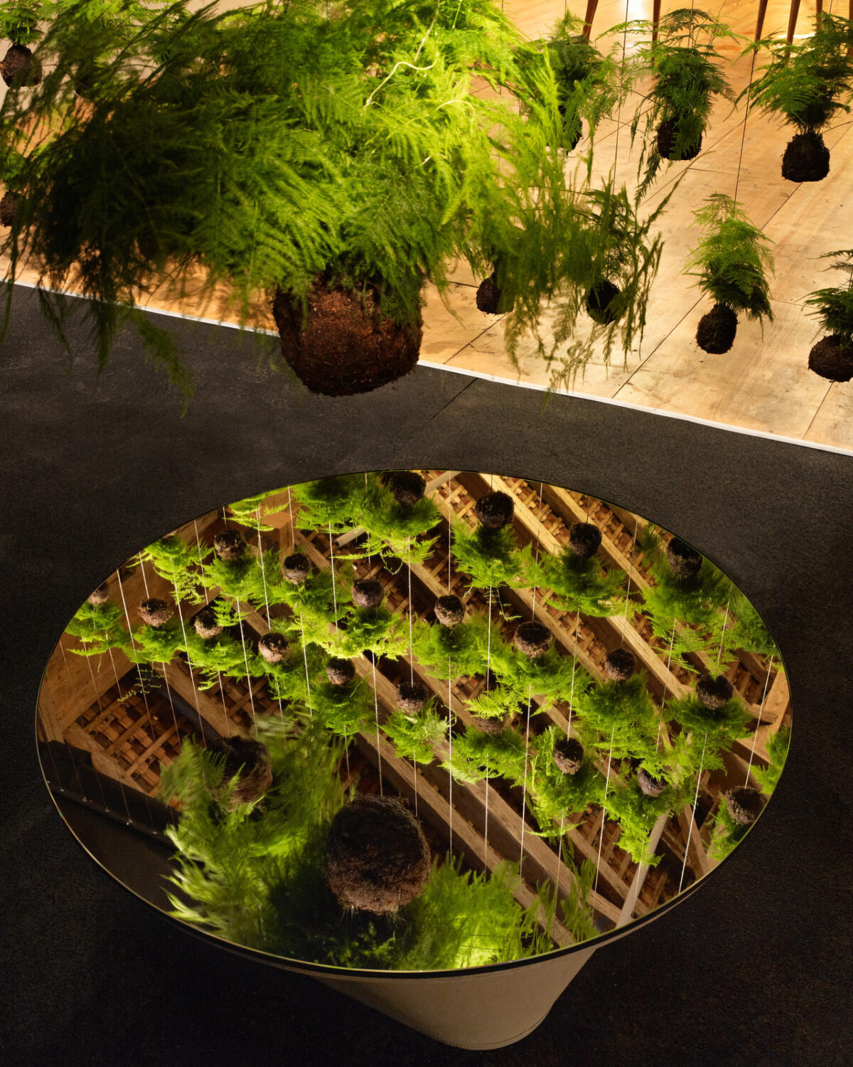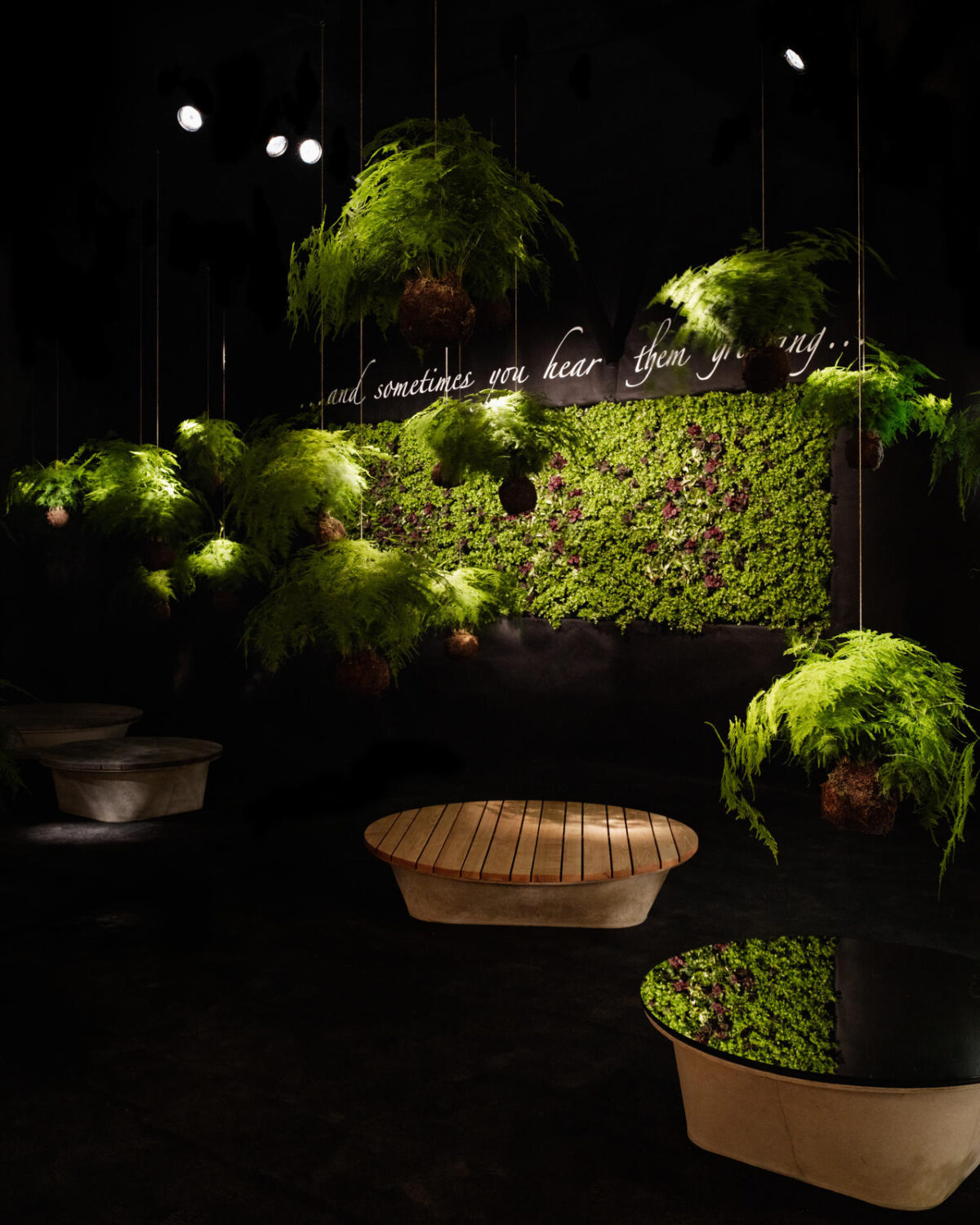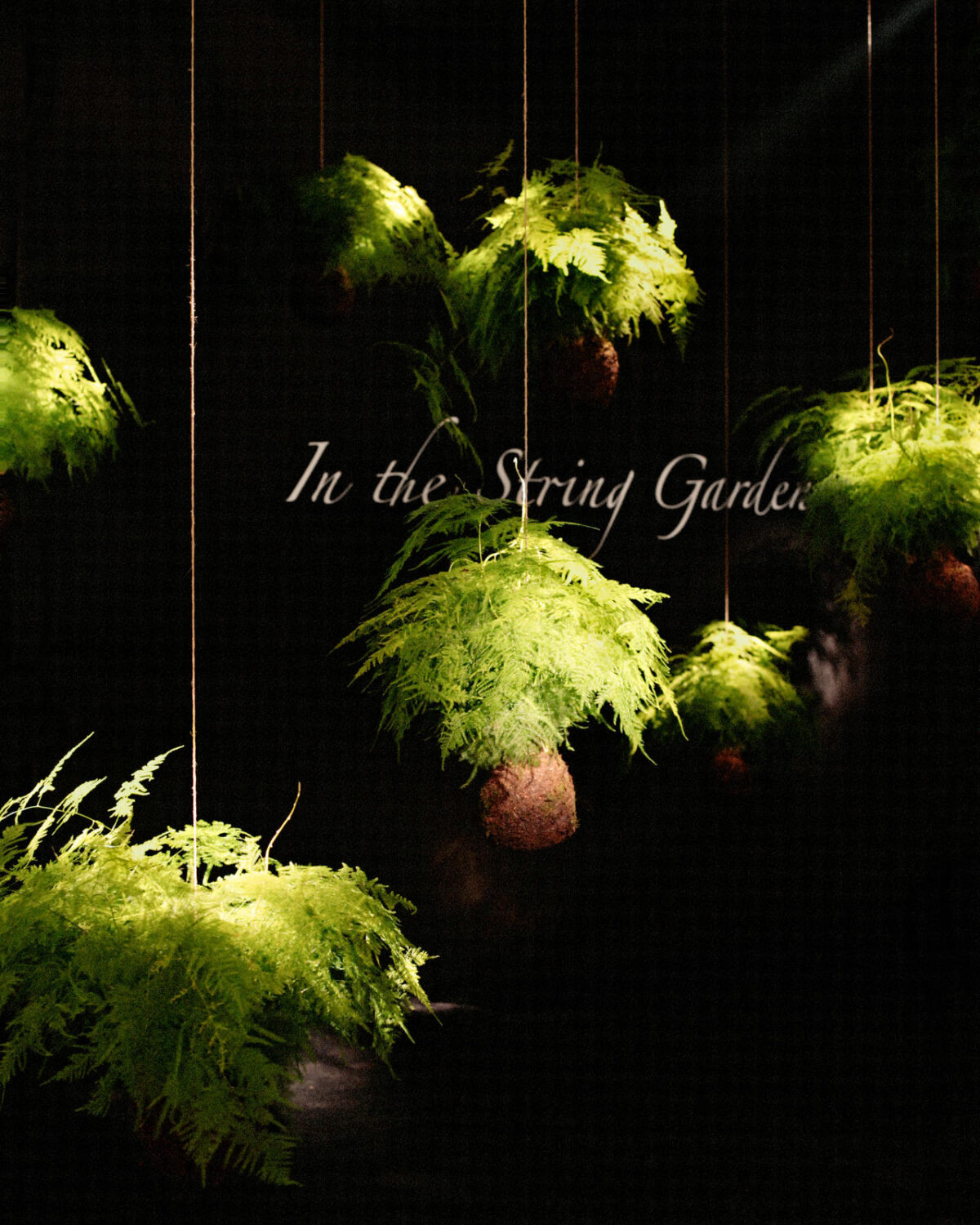 Sie faszinierten, die schwebenden Kugeln, aus denen Pflanzen wuchsen und einen String Garden bildeten. Diese Anwendung geht auf eine traditionelle Technik der japanischen Pflanzengestaltung, des ‹Kokedama›, zurück. ‹Kokedama› bedeutet übersetzt Mooskugel, dabei handelt es sich um kleine Pflanzenbälle, aus denen, ganz ohne Topf, Zimmerpflanzen wachsen. In der Ausstellung waren die Hängepflanzen in einem dunklen Raum inszeniert. Sitzrondelle luden zum Verweilen ein. Könnte es sein, dass hie und da ein Tiergeräusch zu vernehmen war? Auch das gehörte mit zum Ausstellungskonzept.