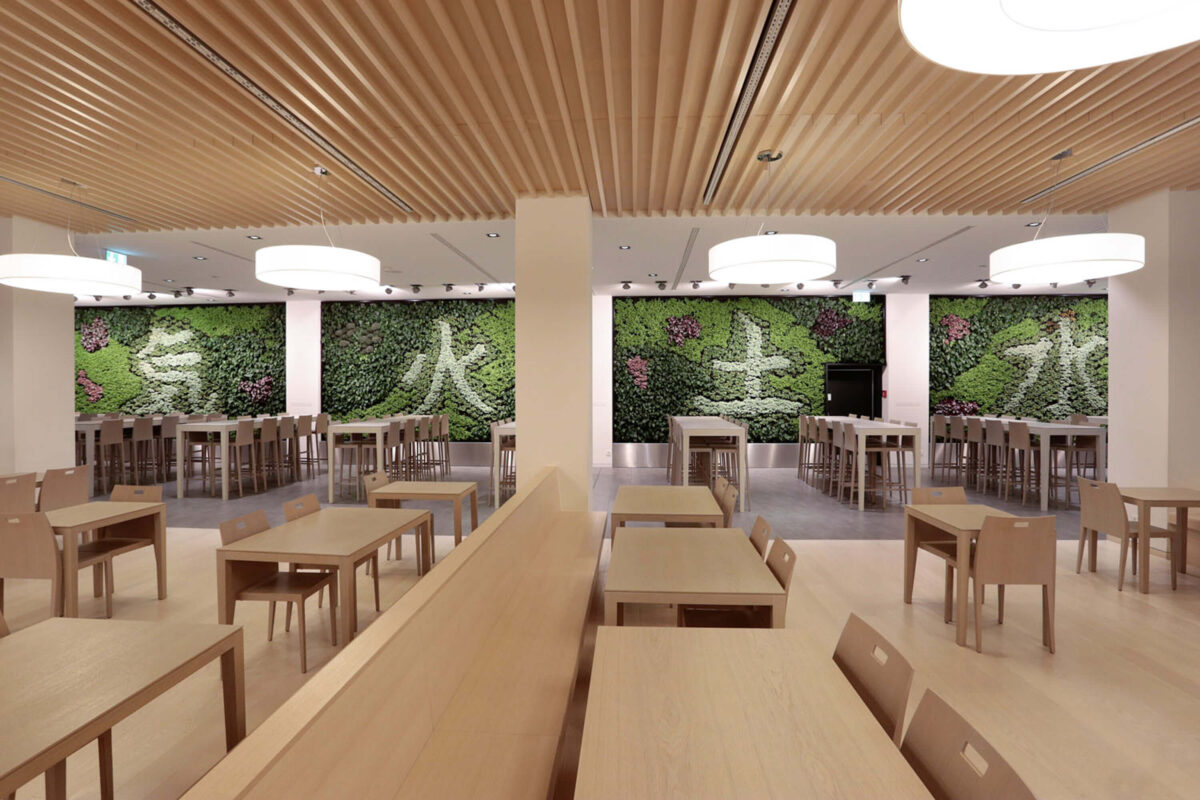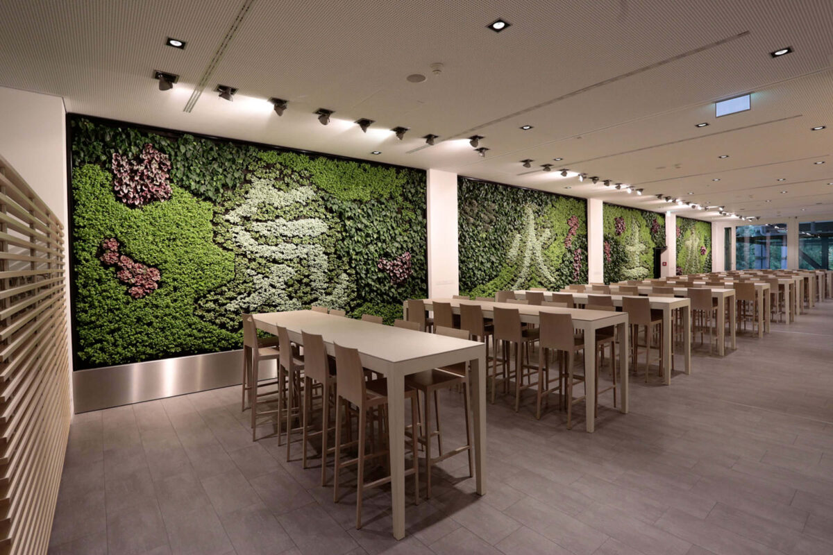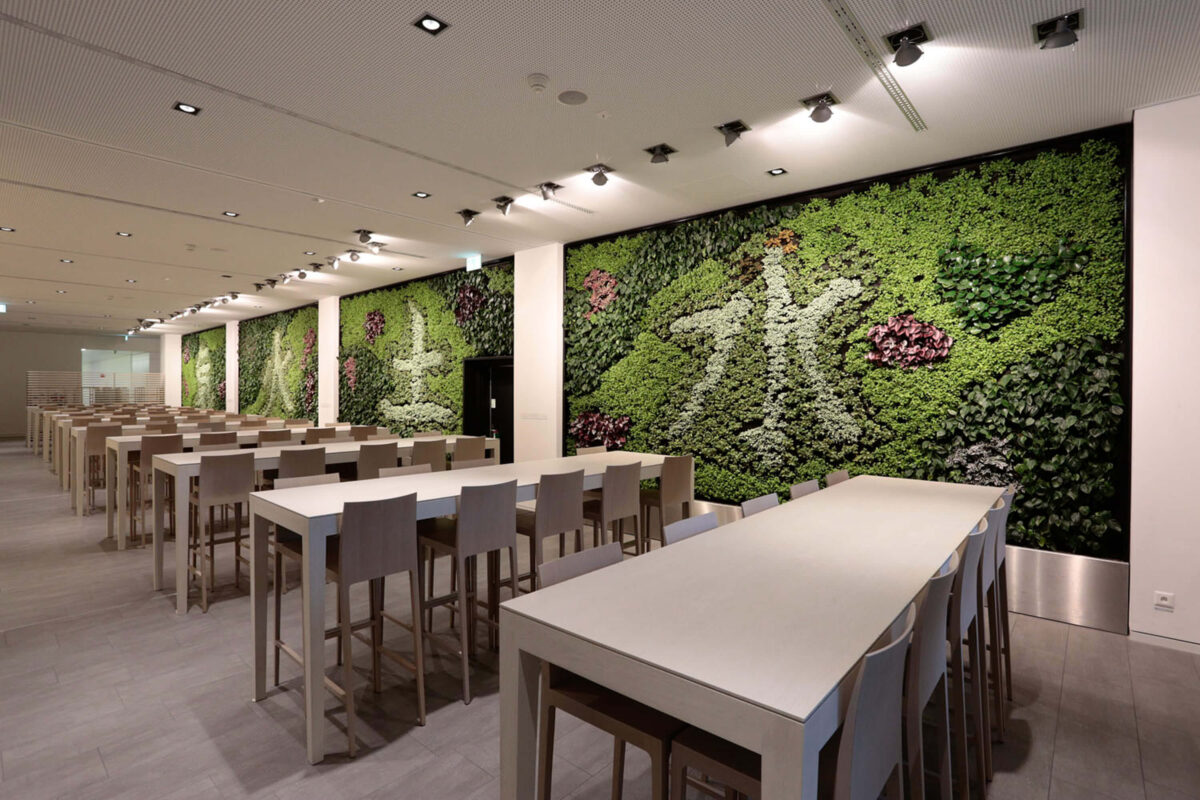 Das Restaurant Feingut im Luzerner Kantonsspital empfang seine Gäste nach einem Totalumbau mit einem veritablen Eyeatcher. Aus vier Wandflächen wachsen die chinesischen Schriftzeichen für die Naturelemente Feuer, Wasser, Erde und Luft. Die natürlich gewachsenen Symbole versetzten Besucherinnen und Besucher regelmässig in Staunen und regen sie zu Diskussionen an.