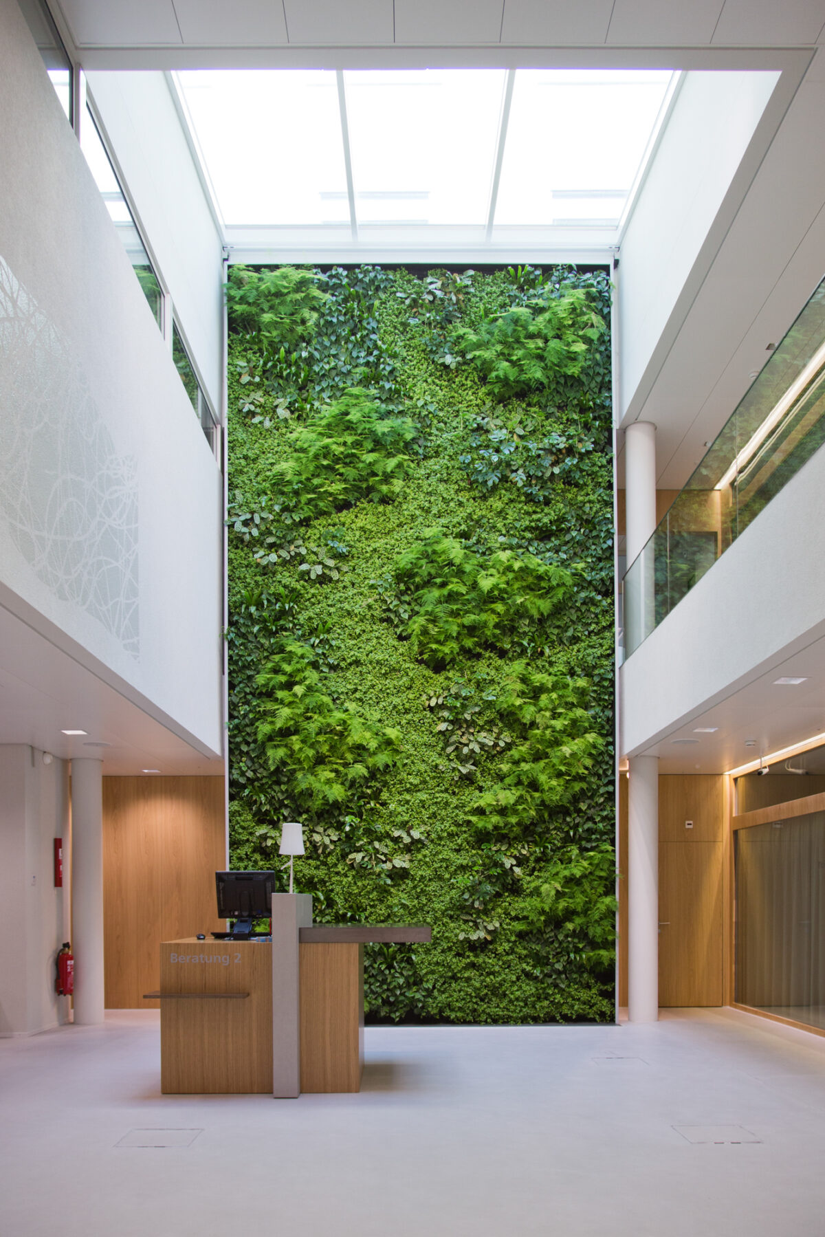 Eine raumprägende Vertikalbegrünung empfängt die Kunden in der lichtdurchfluteten Schalterhalle. Eine raumprägende Vertikalbegrünung empfängt die Kunden in der zweigeschossigen Schalterhalle der Raiffeisenbank im Herzen der Solothurner Altstadt. Gleichzeitig dienen die Pflanzen regelmässig als Kulisse für Kulturelle Events, Vorträge und musikalische Darbietungen im multifunktional genutzten Raum. Das einzigartige Werk entstand durch die beispielhafte Zusammenarbeit von Bauherrschaft, Architekten und Creaplant vom Entwurf über die Planung bis zur Verwirklichung.
