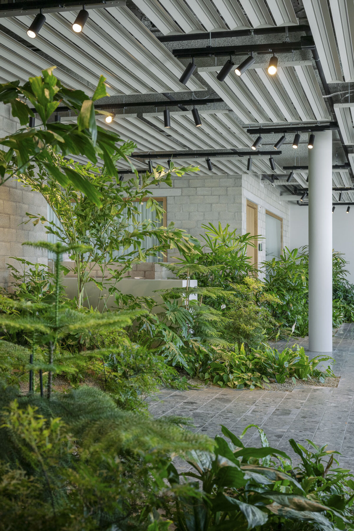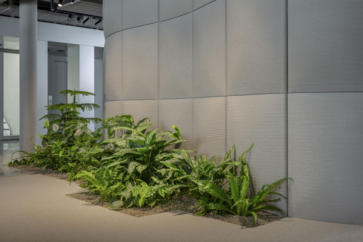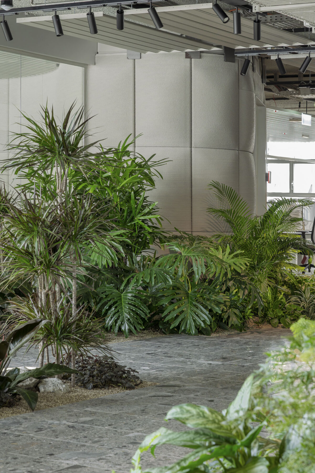 Das Pflanzenkonzept beinhaltet drei unterschiedliche Vegetationsebenen mit insgesamt über 60 Pflanzarten, einer Vielfalt die weit über das herkömmliche Sortiment der Büropflanzen hinausgeht. Die Gestaltungsidee war eine Pflanzenkomposition mit einer maximalen Vielfalt an Blattfarben-, formen und kontrastreichen Vegetationsstrukturen zu erschaffen. einziger Tropfschlauch, keine sichtbare Installation stört das Bild. Die erfahrenen Spezialisten von Creaplant installierten ein ganzheitlich geplantes und vollständig automatisiertes Bewässerungssystem, inklusive Feuchtigkeitssensorik und Fernsteuerung. Mit Hilfe der komplett unsichtbaren Technik wächst die artenreiche Vegetation wie selbstverständlich, als sei sie schon immer Teil des Raums gewesen. Ganz ohne gärtnerisches Wissen und das gut trainierte Auge des Unterhaltsteam von Creaplant funktioniert auch diese Pflanzenwelt nicht. Seit der Fertigstellung wird ein extra entwickeltes Pflanzenschutzprogramm angewendet, das durch den regelmäßigen Einsatz von Nützlingen eine natürliche Balance zwischen nützlichen und schädlichen Organismen zum Ziel verfolgt.